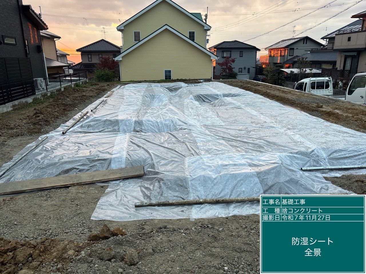 基礎工事の初期段階では、地面からの湿気を遮断する防湿シート施工が重要です。