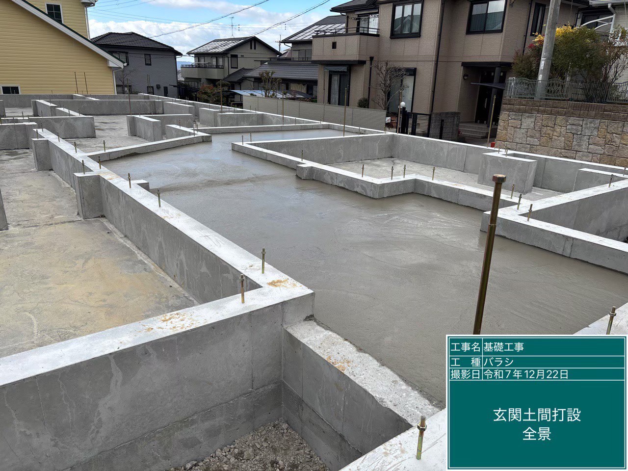 施工写真では、基礎立ち上がり部分と玄関土間が一体的に施工された全景が確認できます。