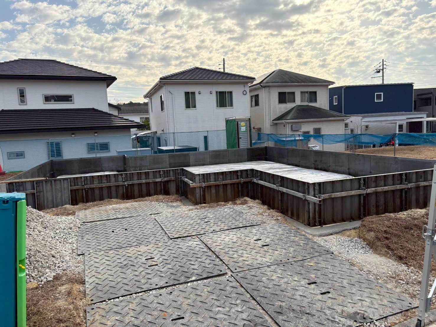 周辺住宅との調和を保ちながら、整理整頓された現場環境が維持されています。