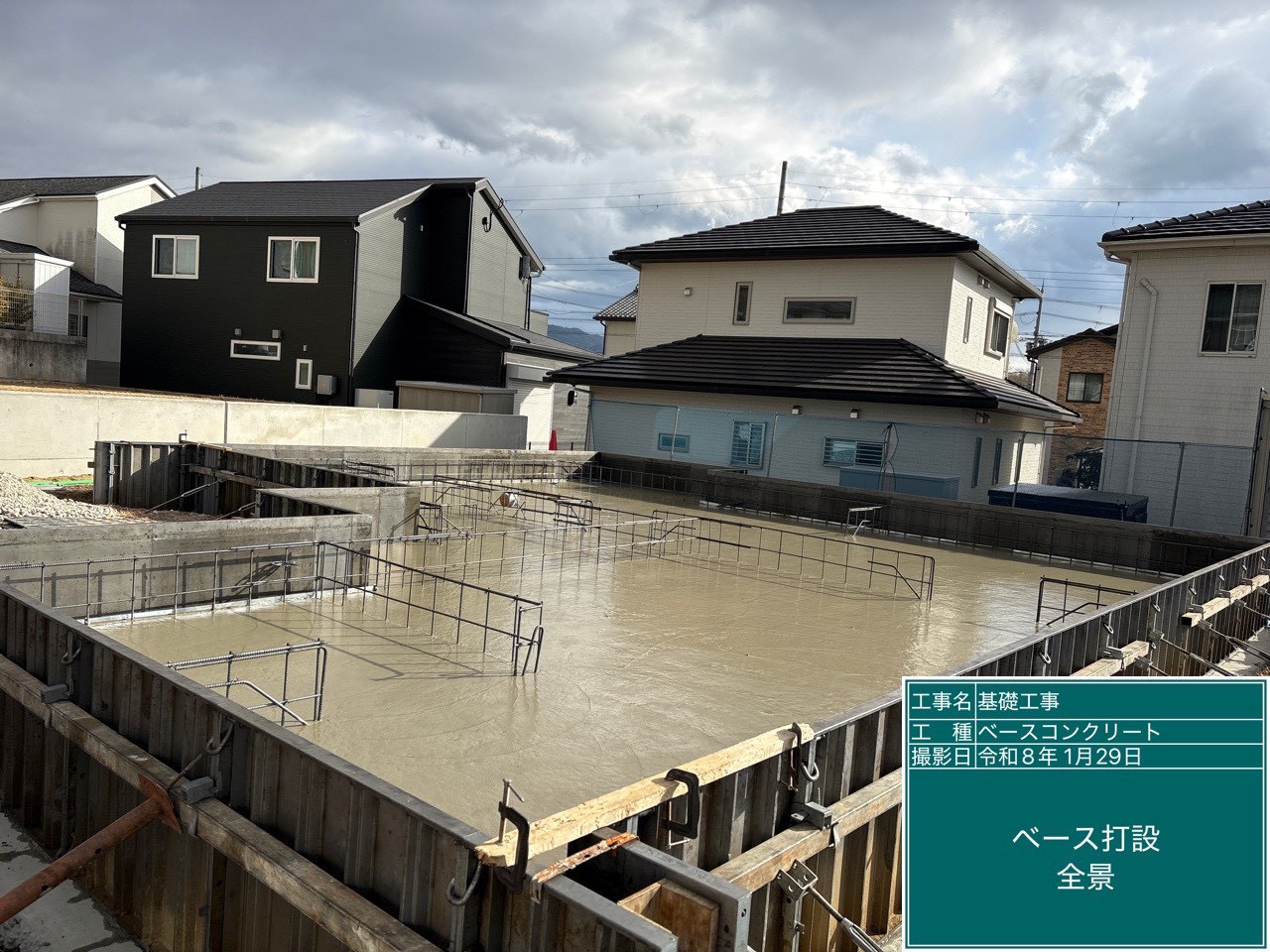 基礎内部の土間コンクリートも平滑に仕上げられ、上部構造の施工準備が整いました。