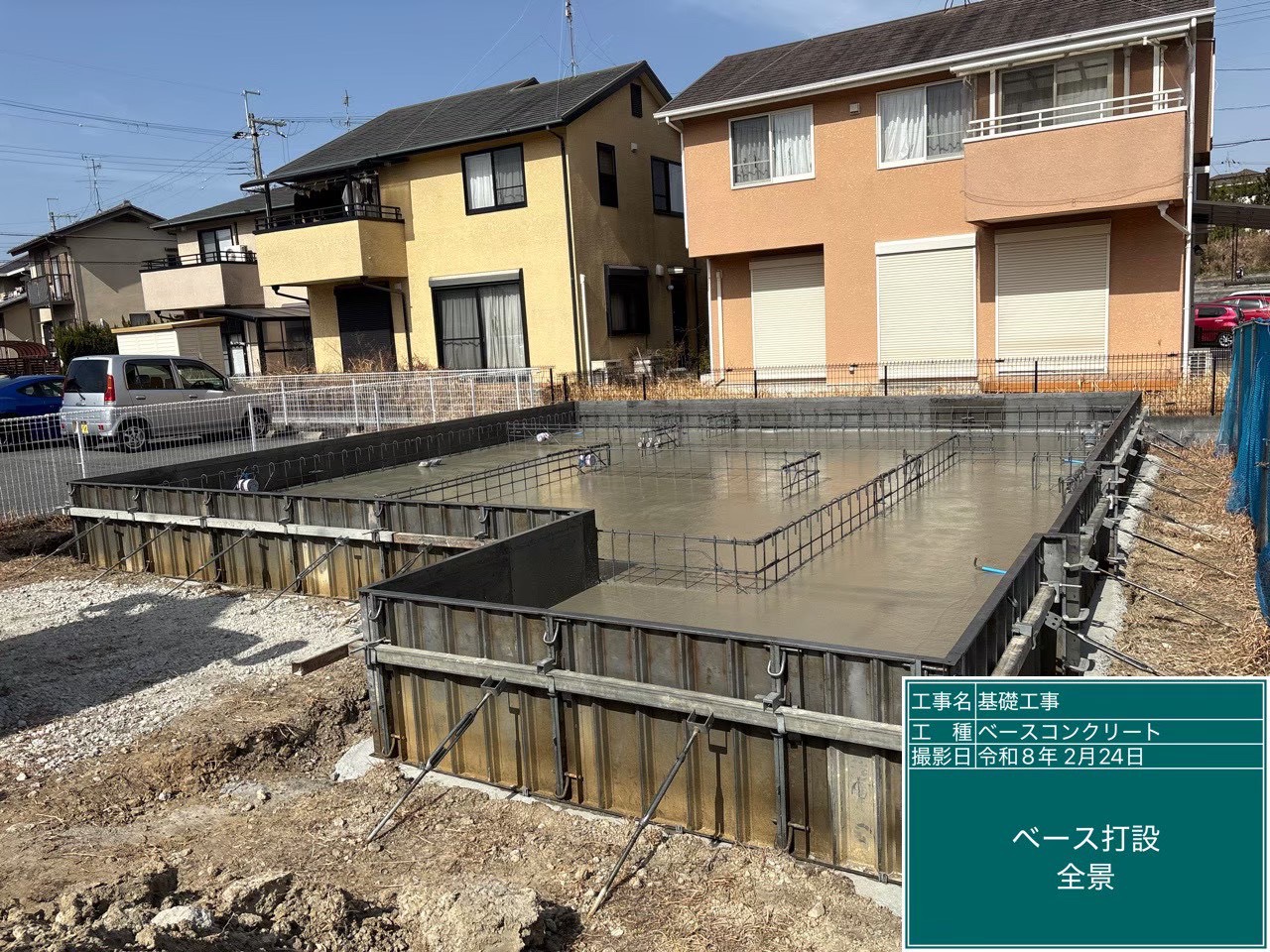 その後、令和8年2月24日には型枠内にベースコンクリートを均一に打設し、表面を鏝(こて)で平滑に均す作業を行いました。