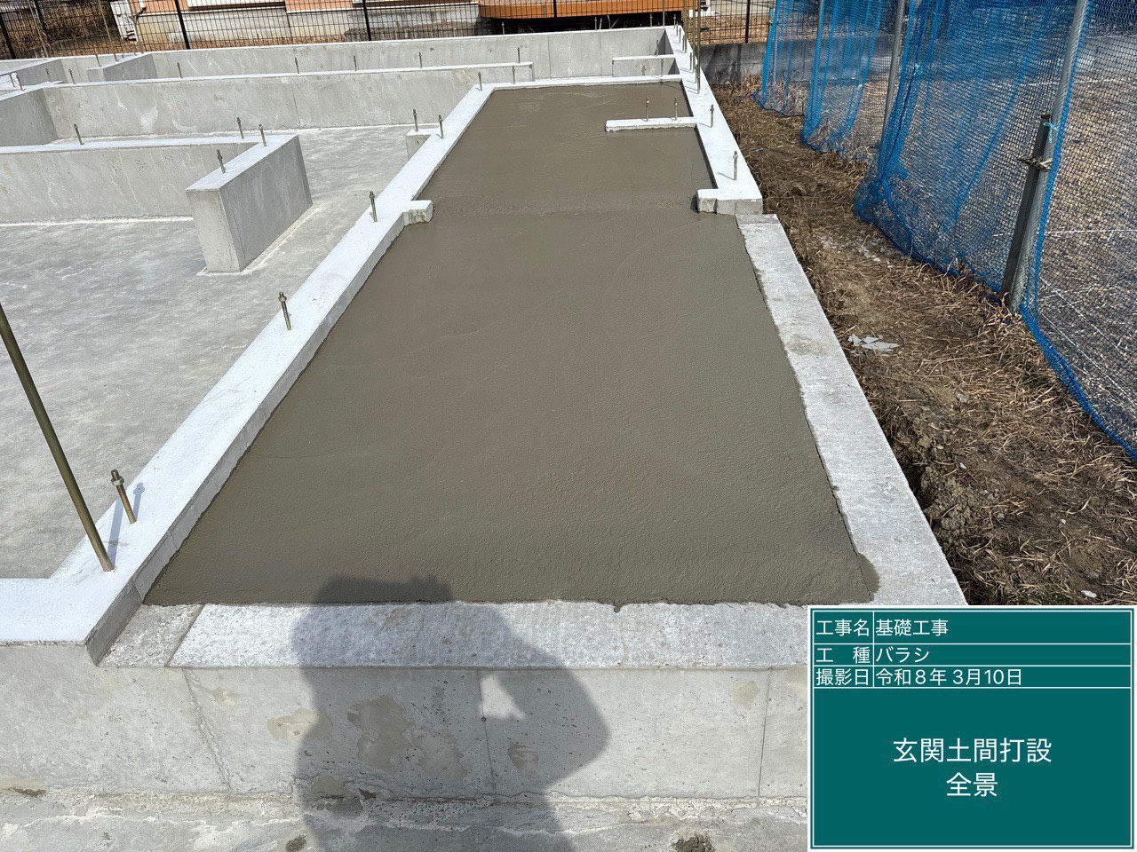十分な養生期間を経てコンクリートが硬化した後、令和8年3月10日には型枠を解体(バラシ)し、建物の出入り口となる玄関部分に土間コンクリートを打設して綺麗な仕上げを施しました。